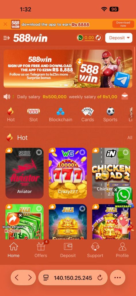 588Win Game is an entertaining and beginner-friendly app that combines casino-style and prediction games with the chance to earn real money. Its simple interface, daily bonuses, referral rewards, and support for local payment methods like EasyPaisa and JazzCash make it appealing for casual players.